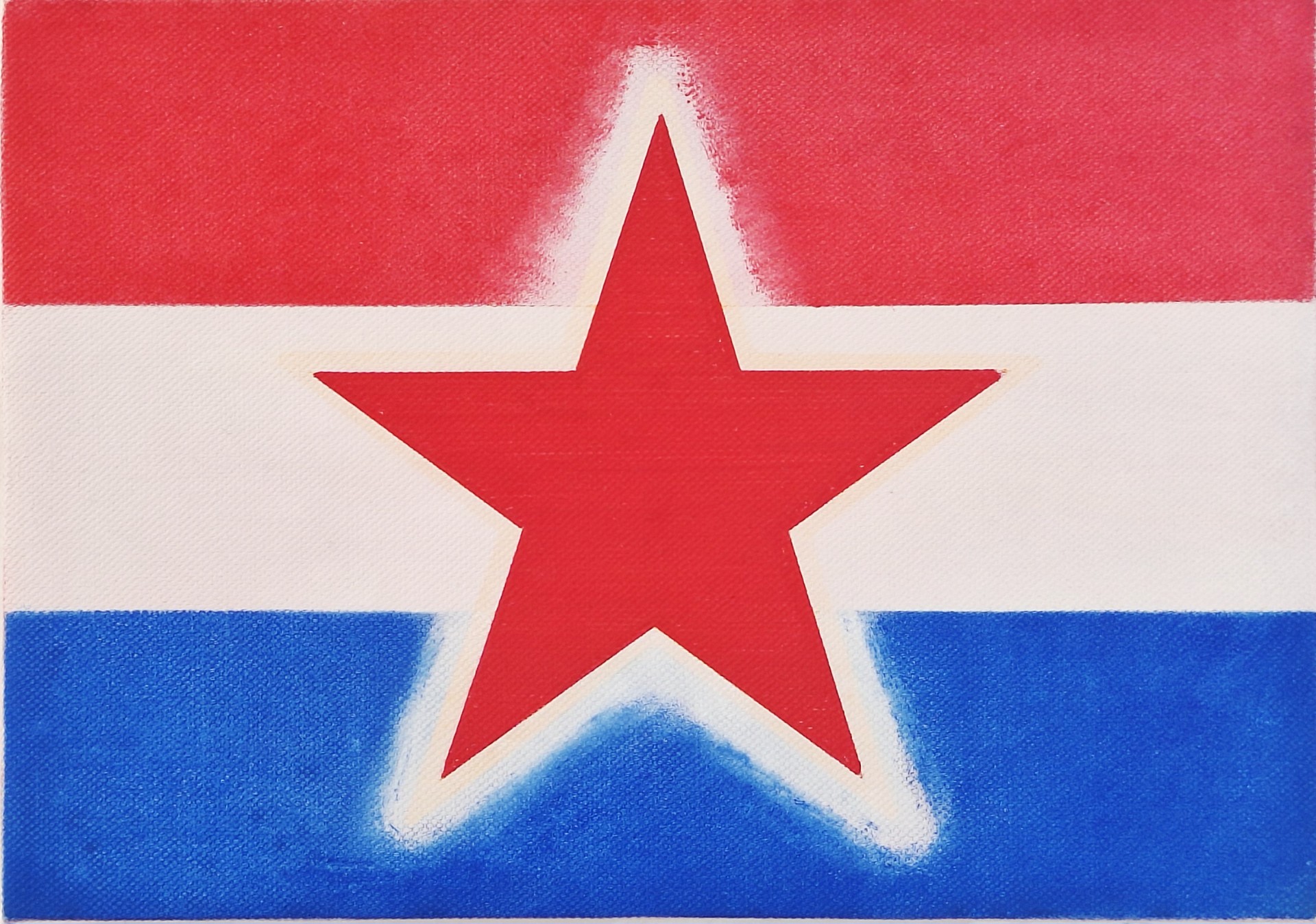 26Dit recente schilderij kwam tot stand als een ironisch commentaar op een fictieve (nieuwe) politieke werkelijkheid. Met referenties naar de ideologische rode ster in de vlag van alternatieve politieke realiteiten.